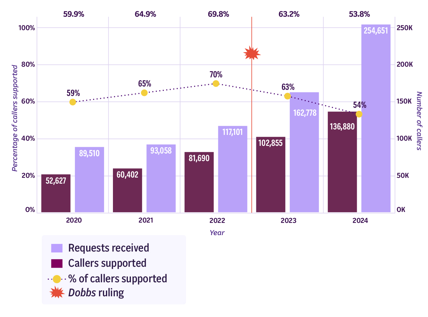 From 2020 to 2022, requests from abortion seekers and the support they received increased steadily each year.